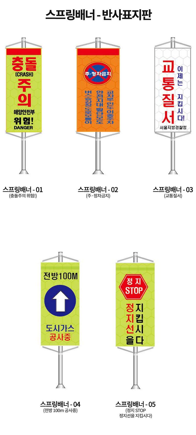 home > 표지판/안전수칙/현수막 > 도로-교통표지판 > 스프링배너-반사 > SB-01~05 스프링배너 세트