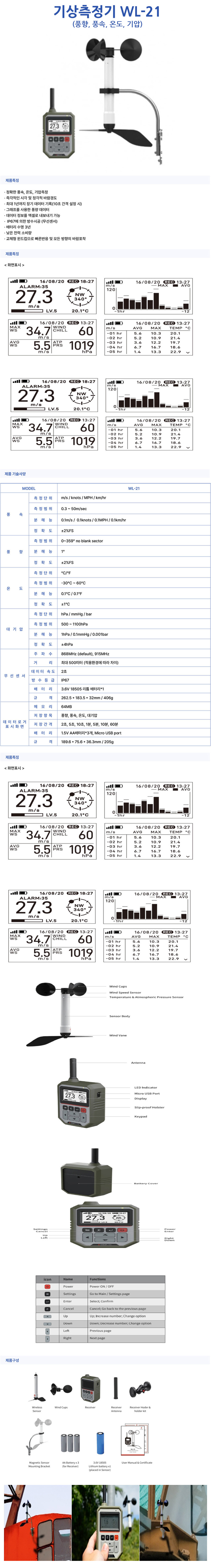 home > 계측/공구/자재/발파 > 소음.온습도-환경 > 풍속-풍량계 > WL-21 기상측정기(풍향/풍속/온도/기압)