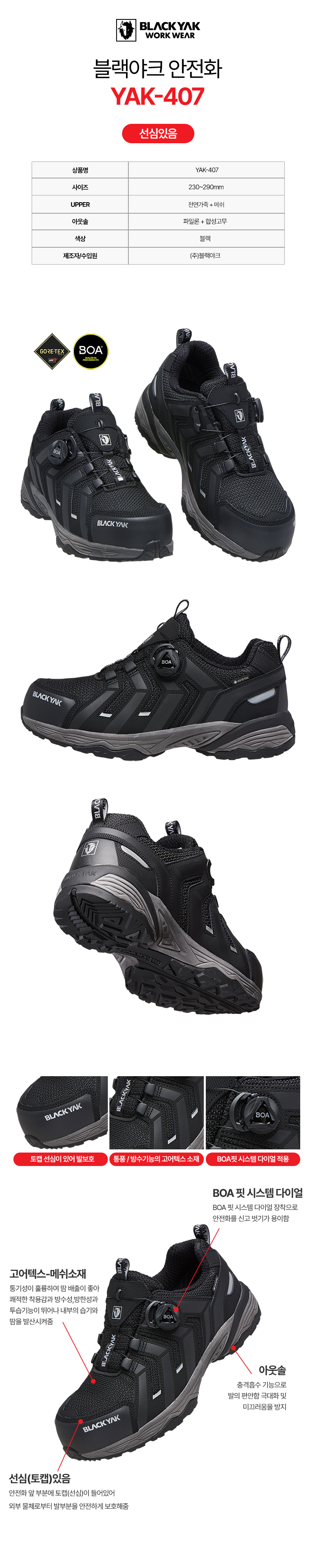 - home > 안전화/안전장화/각반 > 블랙야크-YAK > 블랙야크 YAK-407 고어텍스 안전화(블랙-다이얼.통풍방수)